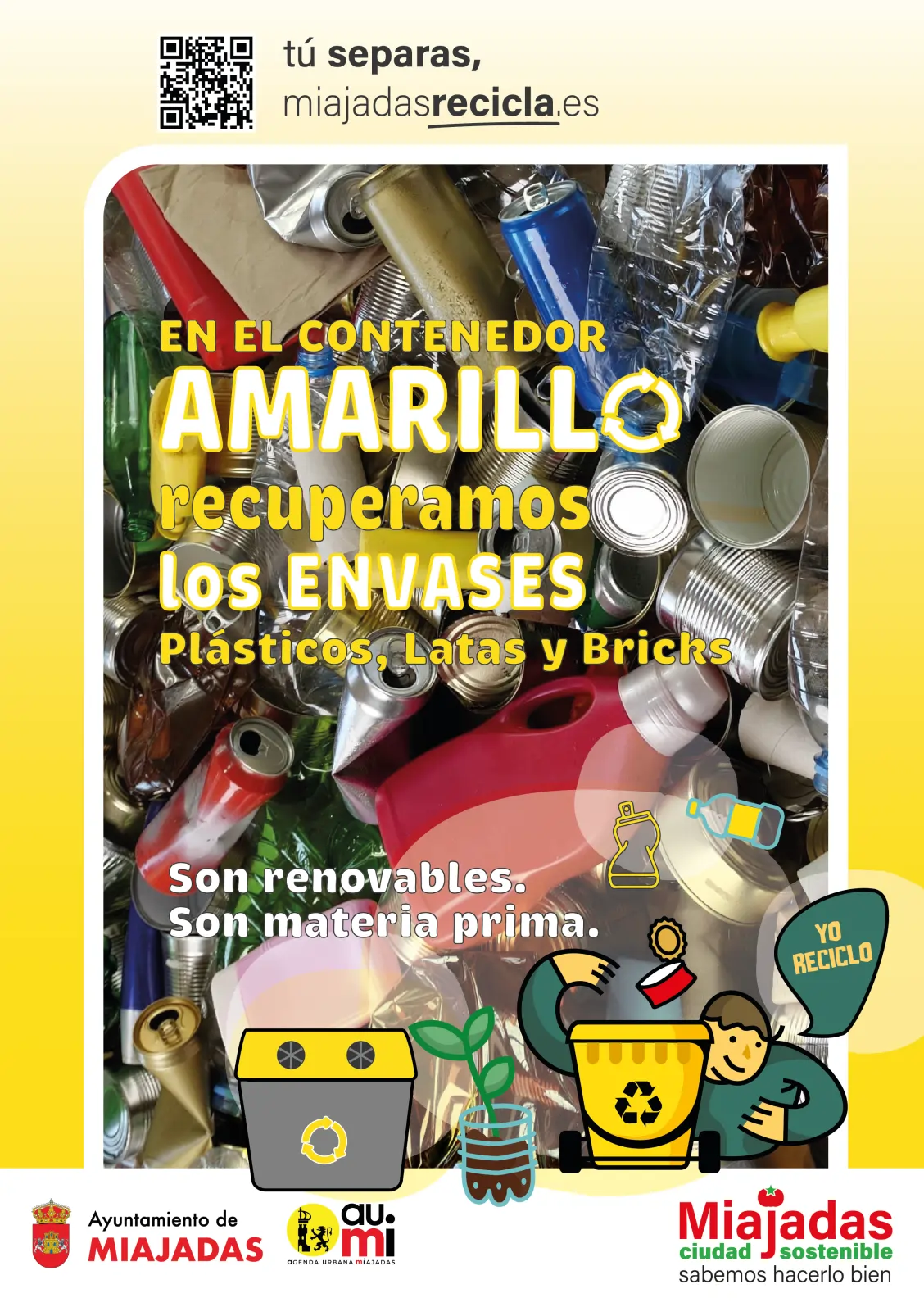 Cada cosa en su contenedor: al amarillo, latas, briks y envases de plástico. Separa bien en casa tus residuos. Un pequeño gesto que ayuda a ahorrar al municipio y hace más eficiente el reciclaje.